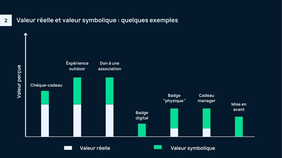 En résumé, l’originalité de la récompense contribue à augmenter sa valeur symbolique et donc la valeur perçue totale. On peut proposer la formule suivante : Valeur perçue = valeur réelle + valeur symbolique.